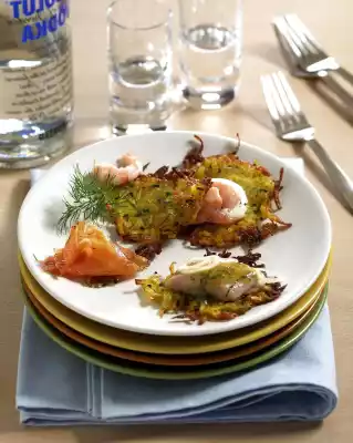 Rösti With Gravlax, Mustard Herring And Shrimps