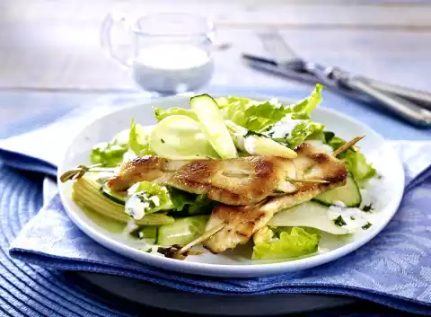 Chicken Skewer On Colourful Garden Salad With Herb And Sour Cream Dressing