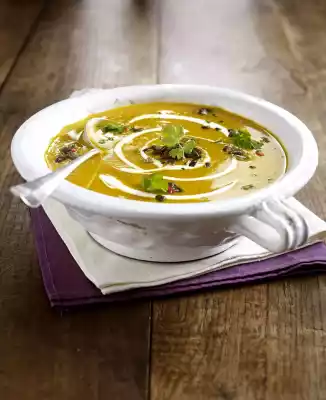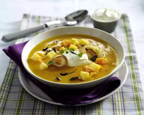 Pumpkin Soup: \"piquant & Fine\", With Onion Rings, Cheese And Marjoram