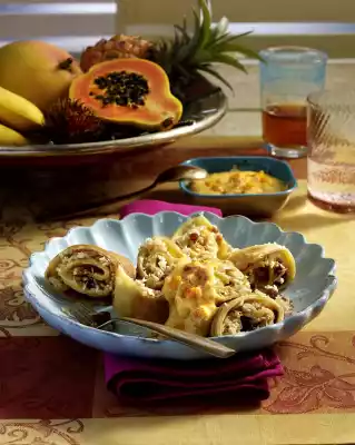 Mango Rolls With Herb Rice And Cream Cheese Filling With Paprika, Tomato, Eggplant And Sugar