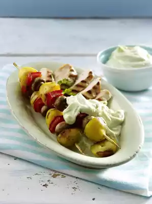 Potato And Vegetable Skewers With Avocado Dip