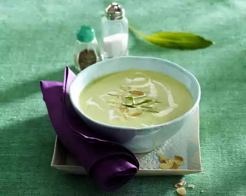 Lactose-free Cream Of Wild Garlic Soup With Smoked Salmon And Flaked Almonds