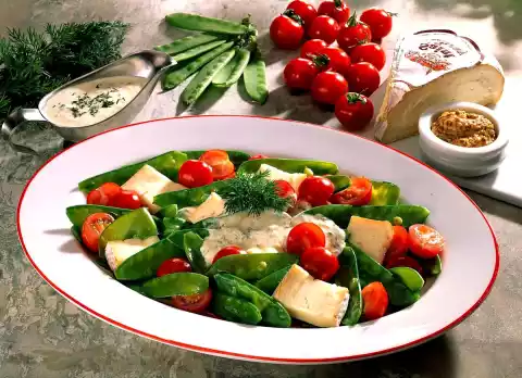 Salad Of Sugar Peas, Cherry Tomatoes And Cheese With