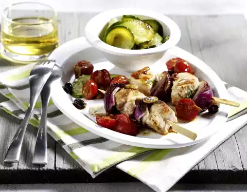 Turkey Skewers With Tomatoes And Zucchini Vegetables