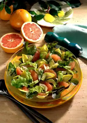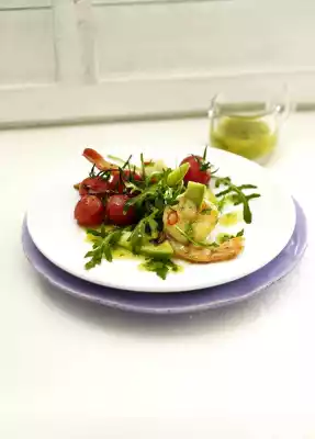 Fried King Prawns On Rocket-avocado Salad With Cherry Tomatoes In Chilli-basil Vinaigrette