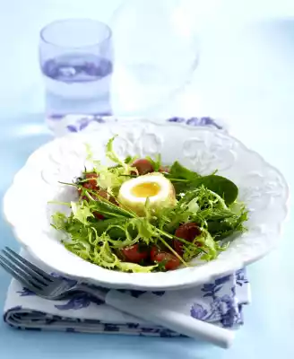 Waxy Eggs In Coconut Rusk Coat On Spinach Salad With Melted Tomatoes And Frisée