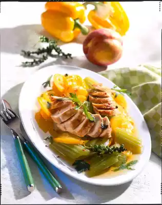 Glazed Roast Ham With Tomatoes, Corn On The Cob And Shallots