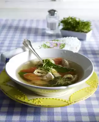 Clear Chicken Soup With Crêpe Rolls, Mangetout, Carrots And Cress