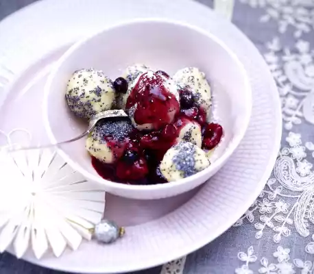 Mini Quark Dumplings With Poppy Seeds And Berry Jelly