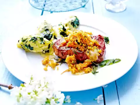 Veal Back Steak With Carrot Crust For Spinach Sparrows