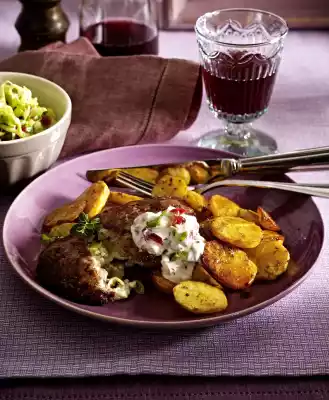 Wood Chips "Bifteki" With Oven-roasted Potatoes And Paprika Tzatziki
