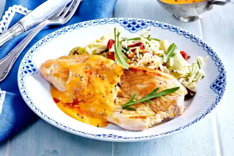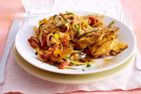 Asian Noodles In Tomato-coconut Sauce With Curry Escalope
