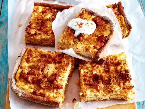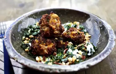 Cheddar Dumplings With Spinach & Peanut Bacon