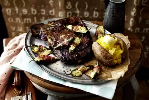 Stuffed Ham Jalapeños With T-bone Steak And Baked Potatoes