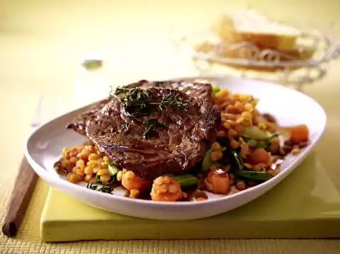 Thyme Steaks With Balsamic Lentils