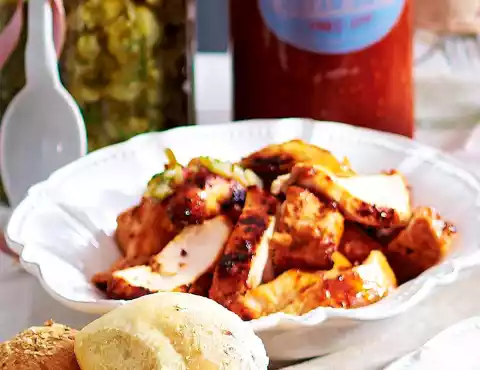 Braised Roast Chicken With Mashed Pumpkin And Red Cabbage Salad
