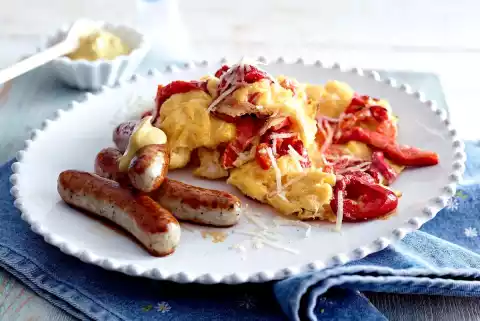 Paprika-Parmesan Scrambled Eggs With Fried Sausages