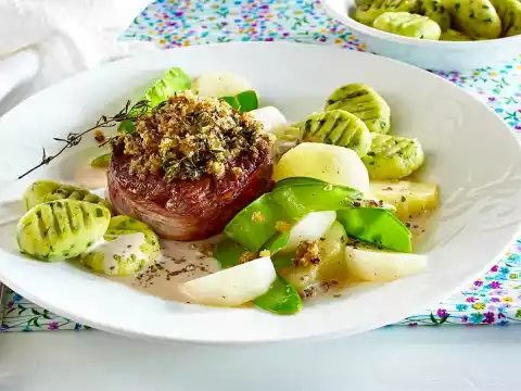 Beef Filet Steak With Pepper Crust With Wild Garlic Gnocchi And Fine Vegetables