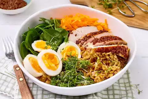 Green Spelt Punch With Waxy Soft Egg And Chicken Filet