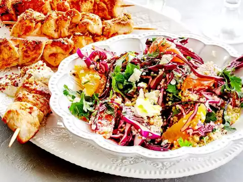 Chicken Skewers With Couscous Salad & Dukkah Dip