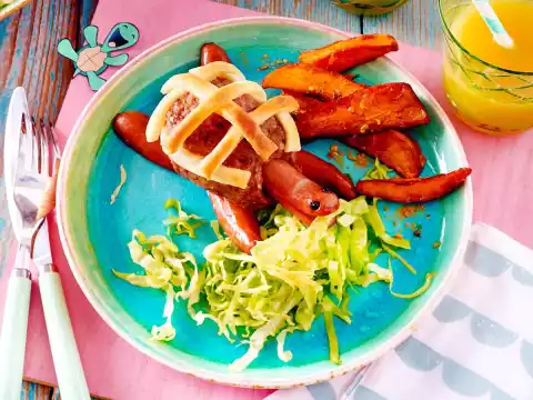 Minced Sausage Turtle With Salad And Sweet Potato Fries