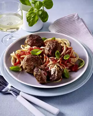 Meatballs Filled With Dried Tomatoes, Ricotta, Basil On Spaghetti Arrabbiata