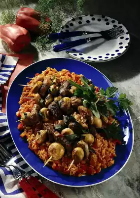 Mushroom Meat Skewers On Paprika Risotto