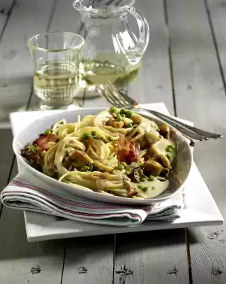 Spaghetti With Mushroom-cream, Peas And Bacon