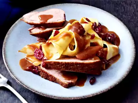Turkey Medallions With Almond And Herb Crust With Ribbon Noodles And Curry Sauce