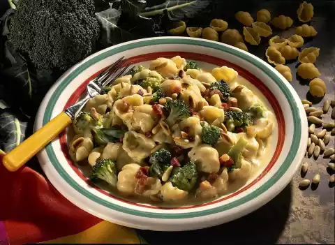 Broccoli Pasta With Cheese Sauce, Pine Nuts And Bacon