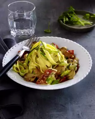 Rice Noodle Risotto With Green Asparagus, Cherry Tomatoes And Coconut Milk