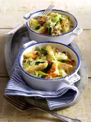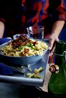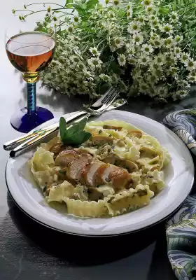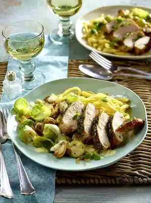 Spätzle With Brussels Sprouts And Chicken Fillet In White Wine Cream Sauce
