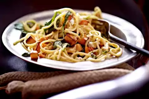 Pasta With Spinach, Diced Sweet Potatoes And Goat Cream Cheese