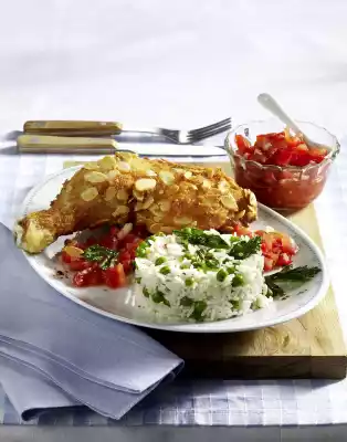Chicken Legs With Almond Breading With Tomato Salsa And Risi Bisi