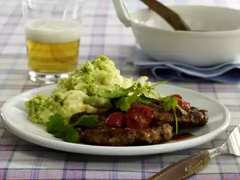 Small Spicy Minced Steaks With Avocado Mashed Potatoes