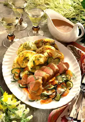Zucchini Crêpes With Rosemary Vegetables And Pork Fillet