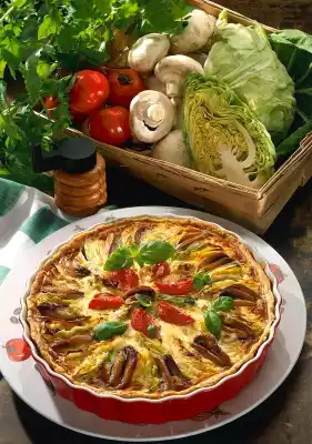 Pointed Cabbage Quiche With Mushrooms And Tomatoes