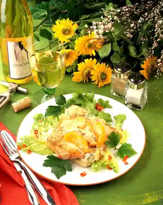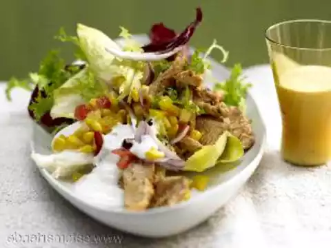 Colorful Salad Bowl With Spicy Chicken And Parmesan Dressing