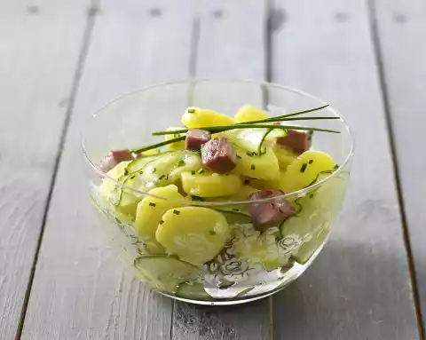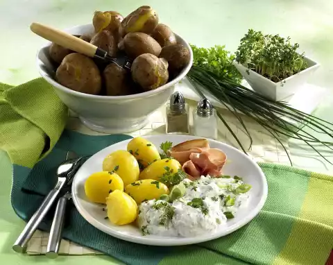 Filled Baked Potato With Rump Steak, Onion And Herb Butter And Salad