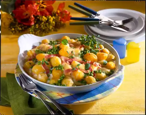 Bechamel Potatoes With Ham And Peas