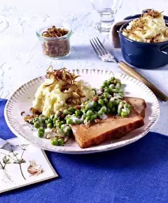 Fried Leberkäse With Roasted Onions With Celery Mashed Potatoes And Stewed Pea Vegetables