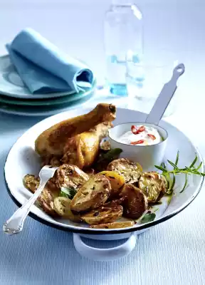 Herb Potatoes From The Tray With Chilli Quark And Chicken Legs