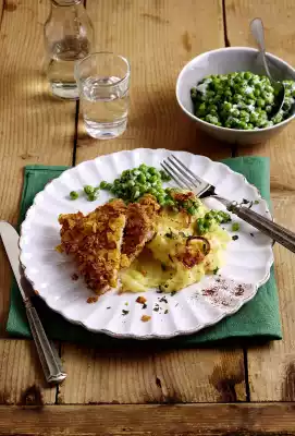 Schnitzel In Taco-panade With Pea-cream Vegetables And Mashed Potatoes