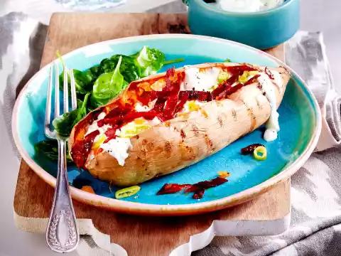Baked Sweet Potatoes With Feta Cream And Chorizo Chips
