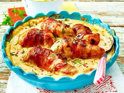 Turkey Breast In Bacon Coat In Cream Cheese Sauce With Mashed Potatoes