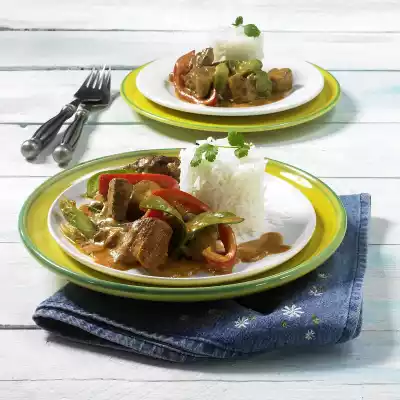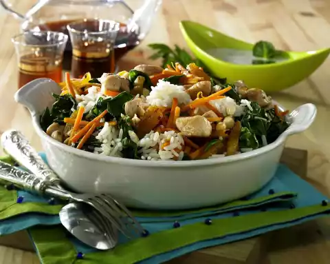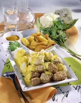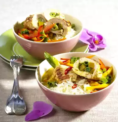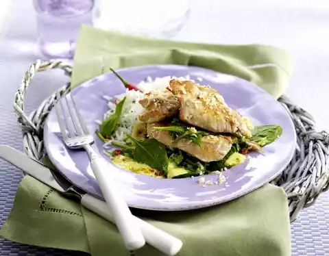 Turkey Medallions In Coconut Coat On Creamy Curry Spinach