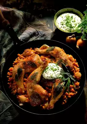 Braised Roast Chicken With Mashed Pumpkin And Red Cabbage Salad
