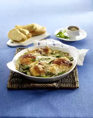Gratinated Chicken Filets In Mustard Sauce With Bacon And Goat Gouda