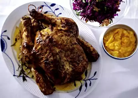 Braised Roast Chicken With Mashed Pumpkin And Red Cabbage Salad