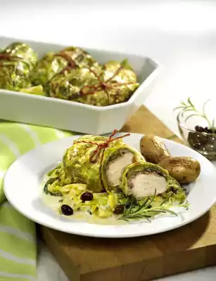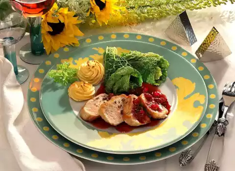 Turkey Filets With Cranberry Sauce And Savoy Cabbage Leaves